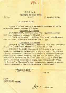 Межотраслевое государственное объединение Укрречфлот / Производственное объединение Главречфлот / Главное управление речного флота при Совете Министров УССР / Главное управление Днепровского речного пароходства при Совете Министров УССР / Днепровское речное пароходство МРФ СССР / Днепровское речное пароходство ММРФ СССР / Днепровское речное пароходство НКРФ СССР / Днепровское речное пароходство НКВТ СССР / Днепровское пароходство